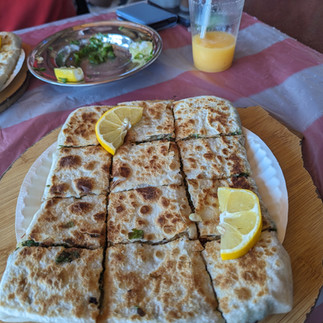 Before getting into Nizwa proper, we stopped at another Yemeni restaurant. I surprised our waiter, who was from Sana’a, by chatting to him in Arabic about Yemen. I ordered another one of my favorite Yemeni dishes, mutabbaq. Muttabaq is a thin pan-fried pancake filled with any number of things such as eggs, vegetables, and/or meat.